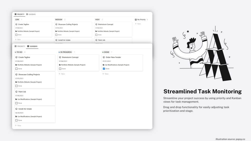 - Priority and Kanban views empower you to easily manage task prioritization and track progress across different stages.