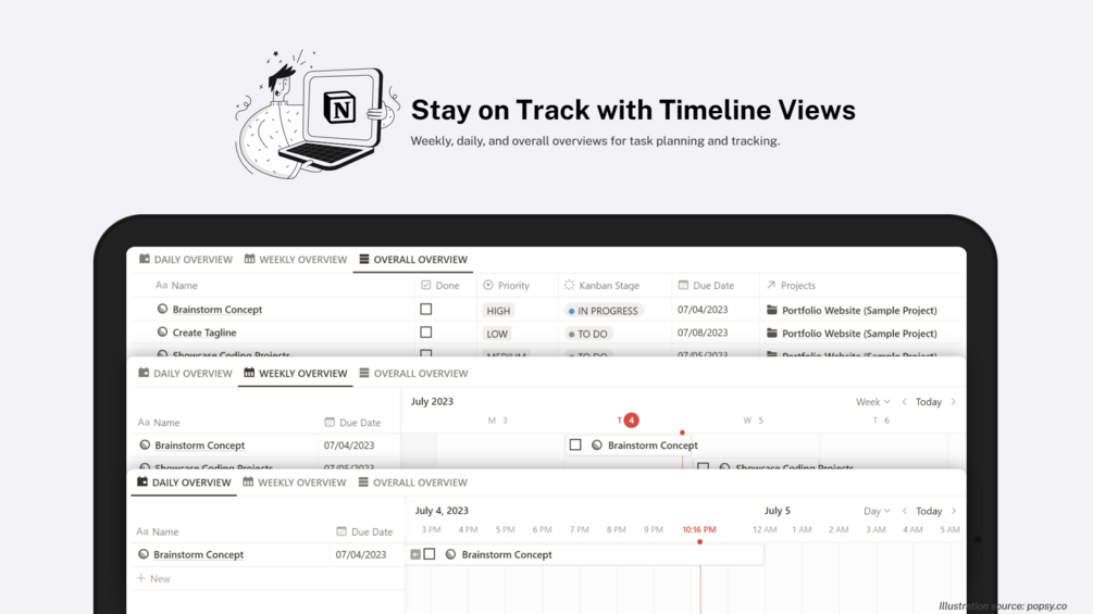 - Weekly, daily, and overall overviews offer comprehensive visibility of your tasks and allow you to plan and manage your time efficiently.