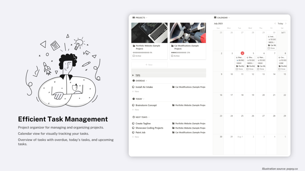 - Overview of tasks with overdue, today's tasks, and upcoming tasks, allowing you to prioritize and plan effectively.